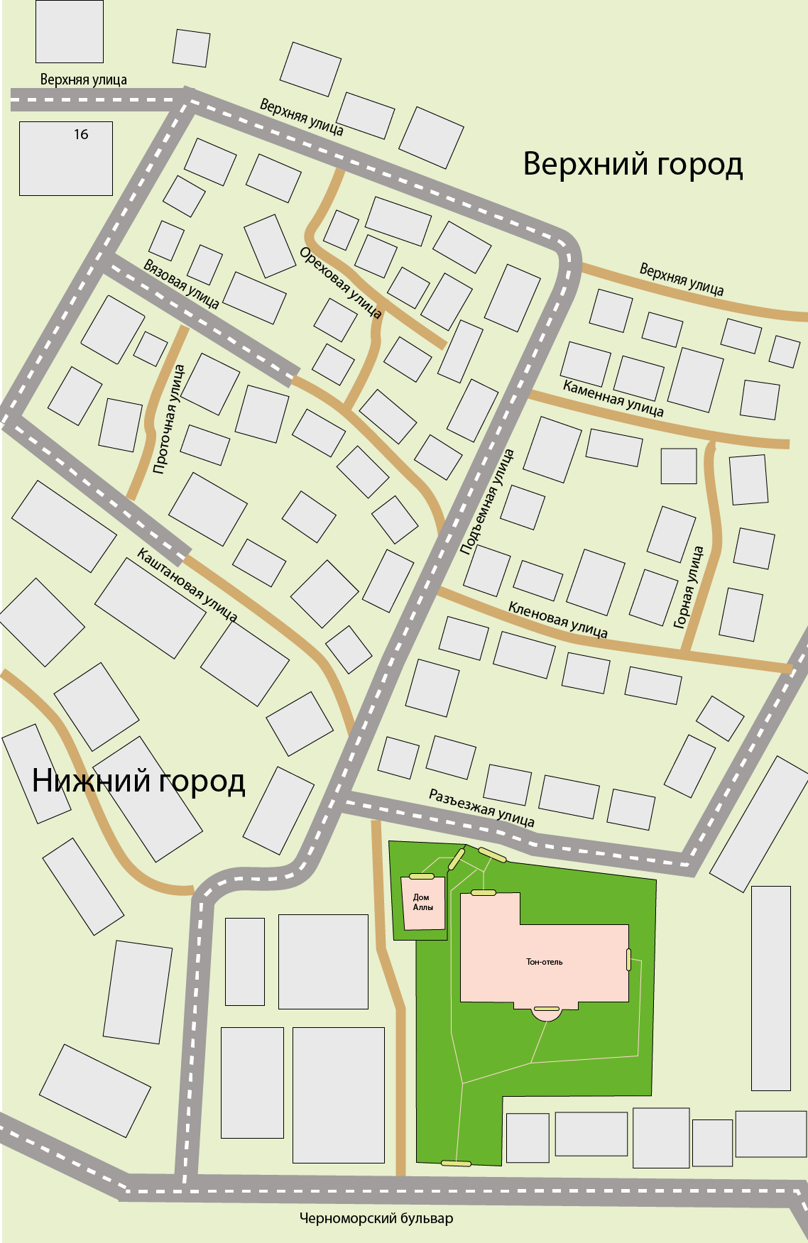 «Тон-отель» — это частная гостиница с пансионом, расположенная на второй линии от моря на Черноморском бульваре в Нижней части Аллоринска. Сразу за гостиницей начинается «частный сектор» — район узких кривых улиц, поднимающихся по склону в Верхний город. Не все эти улицы предназначены для автомобильного движения.