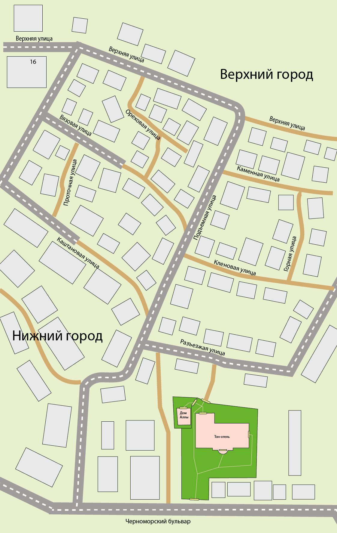 «Тон-отель» — это частная гостиница с пансионом, расположенная на второй линии от моря на Черноморском бульваре в Нижней части Аллоринска. Сразу за гостиницей начинается «частный сектор» — район узких кривых улиц, поднимающихся по склону в Верхний город. Не все эти улицы предназначены для автомобильного движения.